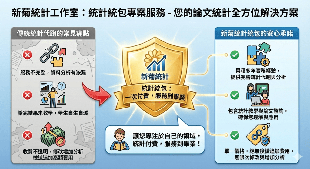 「統計統包」為新菊統計工作室專案服務,本工作室累積多年實務經驗提供論文、投稿期刊完善的統計代跑、統計分析、統計教學及論文諮詢,有鑑於服務多年,本工作室常常會接到服務前一家統計代跑不完整的同學,或給完分析結果後亦未教學,任其自生自滅,或一開始就未講清楚服務收費細項,以致於日後修改或增加分析都被迫追加不少的費用,有鑑於此本工作室聽到很多學生的心聲,提供「統計統包」的概念,讓學生專注於自己的領域,統計就交給專業來處理,「統計統包」 只有一個價格,日後決不會因修改、增加分析而多收您一塊錢,適合對統計不了解的您。